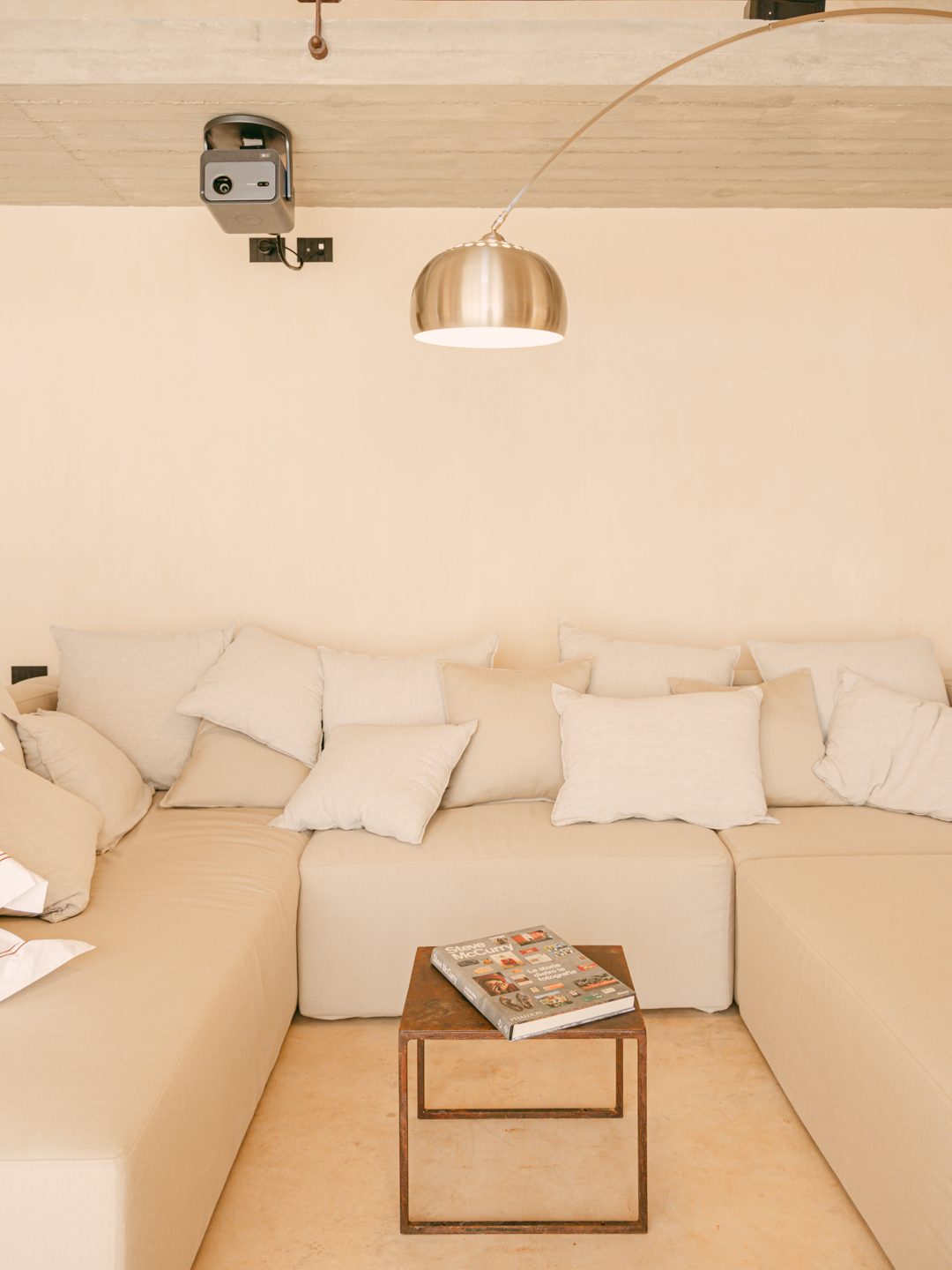Inside is a small cinema room with vaulted ceilings, exposed stone and a white screen that glides softly from above.